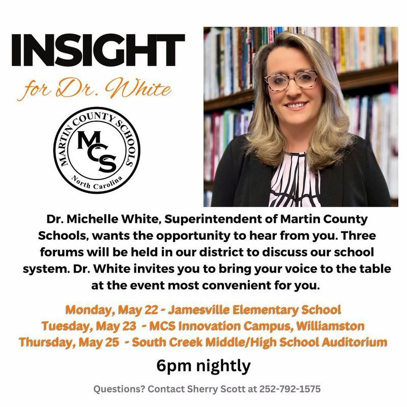 Dr. Michelle White wants to hear from you. We hope you will join us at one of our upcoming events to provide Insight for Dr. White.